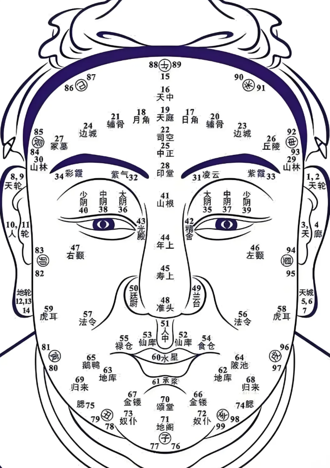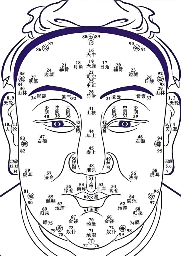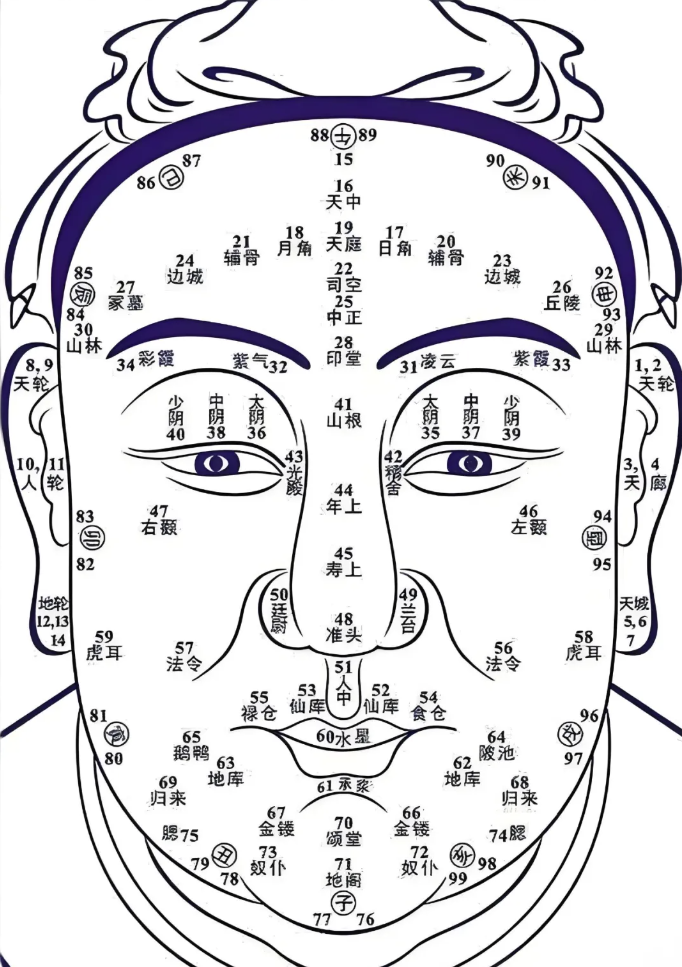 2、“定位流年法”是将“三庭流年法”细化,将东说念主的面部从上到下分红87个部位,男左女右相背,将东说念主生从1岁至99岁分红5个大的阶段,定到每一个部位。具体是少小1-14岁看耳朵,后生15-30岁看上庭,中年31-50岁看中庭,老年51-75岁看下庭,晚年76-99岁这24年两年为一段,看脸型外圈的12时辰部位。