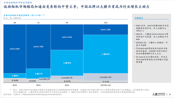在畅通相机界限,也曾占据环球主导地位的是好意思国品牌GoPro,2022-23年,GoPro依靠HERO系列稳居头部,环球阛阓占有率75%以上,但到2025年其收入占环球阛阓份额已逐步减轻至18%。而历程三年,阛阓迎来“新王”——大疆凭借多年策略布局、居品节律及生态协同,快速崛起,到2025年Q3大疆在这个界限的收入占环球阛阓份额已达66%,以竣工上风成为环球畅通相机阛阓第一。