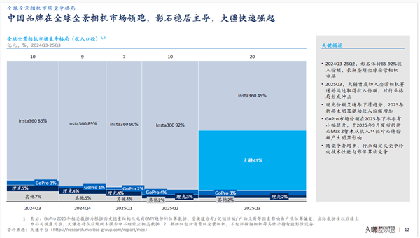 全景相机的阛阓边幅也迎来浓烈变动。大疆于本年7月31日入局该界限,在不到三个月的时刻内,其首款全景相机Osmo360,凭借跨端期骗与高性价比的上风,隔离在中国电商渠谈取得了49%的阛阓份额,环球阛阓份额达43%。