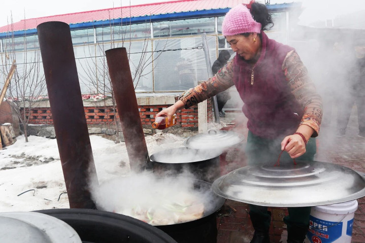 吉林舒兰,村民在作念杀猪菜。(图/中新社记者 苍雁 摄)